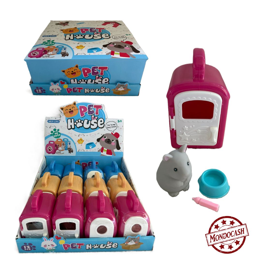 Niche avec un animal et 2 accessoires avec une poignée de transport, chien, lapin, hamster, chat, niche de couleur bleu, rose ou jaune