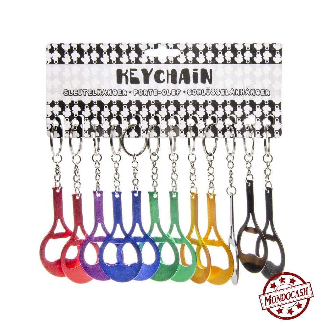 Porte clé en forme de raquette de tennis et qui fait décapsuleur